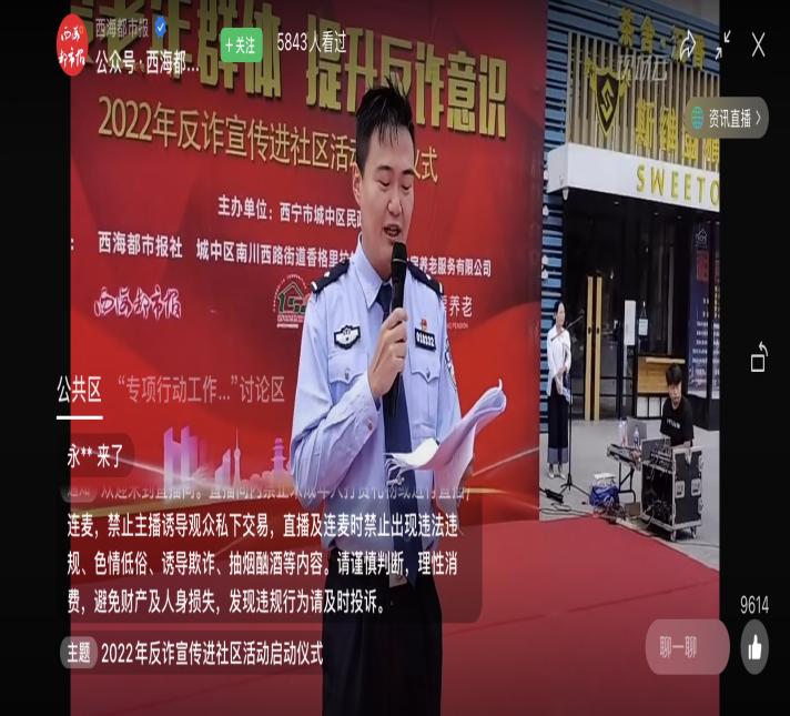 合力促宣,全民动员。近日,由区民政局主办,香格里拉社区、青海中房养老服务有限公司、西海都市报承办的“关爱老年群体 提升反诈意识”主题反诈宣传活动,在香格里拉社区小广场圆满举办。活动现场邀请区公安分局刑侦大队反诈中队警官为老年人分享近期真实诈骗案例,并针对养老诈骗常见手段进行有奖问答,破除老年人“诈骗离我很远”的固有观念,加深老年人对养老诈骗手段的认识,向老年人传达“处处提防、事事谨慎”的防诈理念。本场活动开通线上直播间,6家平台同步直播,获赞3万余次,大力提升了全民反诈意识。