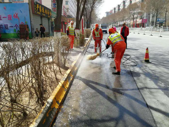 一举措“以洗代扫”全覆盖。2017年底在上级部门的大力支持下中心新购进十辆小型环保高压冲洗车,2018年春季在天气回暖的情况下,中心及时组织人员对辖区开展“以洗代扫”冲洗保洁作业,由原来的主干道延伸至辖区主次干道及背街小巷,作业内容包括:车行道、人行道、车站、果皮箱、雨水井口等地面油污的冲洗保洁,达到“路见本色”的保洁效果;同时,对沿街护栏、花箱、绢花及公益广告牌也进行冲洗保洁,保障辖区公共设施的干净整洁;冲洗作业避免了因人工清扫造成的扬尘空气污染,有效的改善了空气质量。