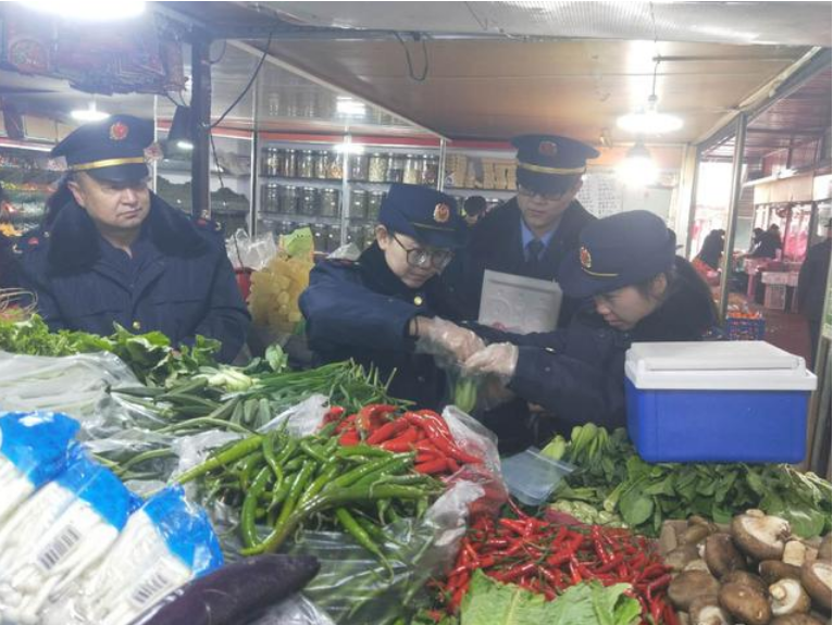 工作人员在总寨镇新庄农贸市场内3家摊位随机抽取小油菜、生菜、白菜等9个批次产品,并使用食品安全快速检测车内便携式一体化检测仪对抽检蔬菜进行有机氯和氨基甲酸酯等农残指标的测定,经快速检测,以上9各批次产品全部合格。