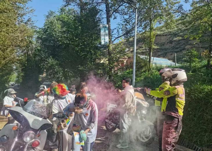 “嘭!”上午9点30分,随着发令枪打响,起点处五彩粉末飞扬,各位运动爱好者竞相奔跑,整个活动中,参与人员统一穿着白色T恤,他们互相装扮,贴脸贴、戴发套、撒彩粉,一路上你追我赶、相互嬉戏,一路欢声笑语。