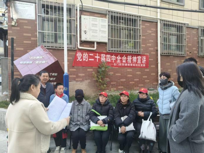 党的二十届四中全会召开以来,仓门街街道迅速掀起学习宣传贯彻全会精神的热潮。街道党工委依托“时代仓声”理论宣讲队打造“仓门说”宣讲品牌,主动将宣讲课堂搬到居民楼院、老党员家中、企业物业等场所,通过一系列接地气、冒热气的面对面、互动式宣讲,让全会精神如春风化雨,滋润党员群众的心田。