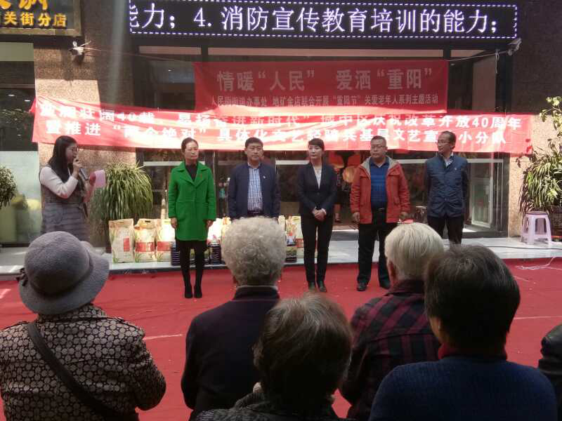 活动分为三个部分一、人民街街道办事处邀请城中区文化馆为辖区贫困老年人送演出,丰富他们的文体生活;二、人民街街道办事处联系辖区地矿金店开展贫困老年人慰问活动,通过慰问的方式,为老年人自己送去温暖;三、重阳节又称“登高节”,地矿金店与街道租车带领老年人参观浦宁之珠,感受改革开放40年西宁翻天覆地的巨变。