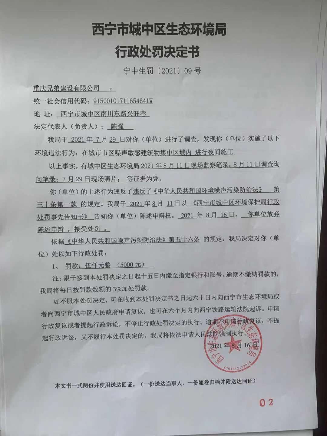 西宁市城中区生态环境局行政处罚决定书 宁中生罚{2021}009号