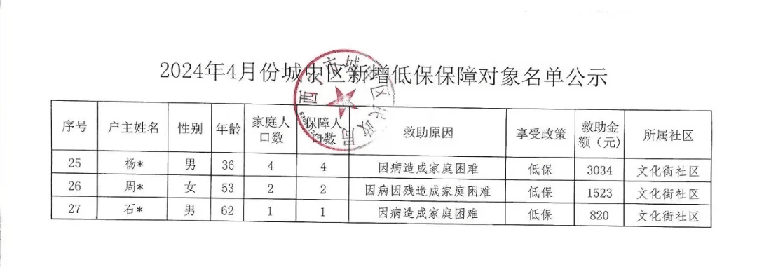 2024年4月城中区新增低保保障对象名单公示